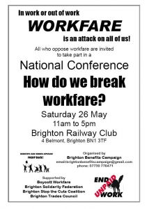 Organised by our friends at the Brighton Benefits Campaign, Saturday May 26th 11am-5pm at the The Railway Club, 4 Belmont, Brighton BN1 3TF.