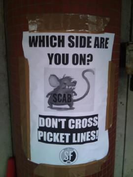 In our supportive picket, Solidarity Federation members made it clear that our solidarity was with the workers in struggle. Scabs leaving the building kept their heads down and scurried away when confronted about their conduct and faced with signs which said "no to scab lies" and asked "which side are you on?"