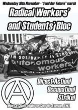On Wednesday 10th November 2010 the NUS and UCU have organised a demonstration in London in protest against the cuts in education. We are calling on all anarchists and militant workers and students to join us in forming a 'Radical Workers' and Students' Bloc' on the demonstration, arguing for all those in education to fight the cuts based on the principles of solidarity, direct action, and control of our own struggles – not for a struggle controlled by union bureaucrats and political ‘leaders’ who can only go so far.
